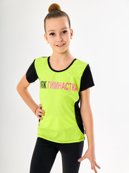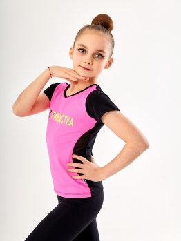 Футболка с хештегом, вызвала особый интерес у многих гимнасток, яркая, стильная. Нанесение ЯЖГИМНАСТКА из термопленки, но нанесено в термопрессе, поэтому напрочь приклеена и не сойдет после многих стирок. По бокам у футболки сеточка. Сзади футболка черная.